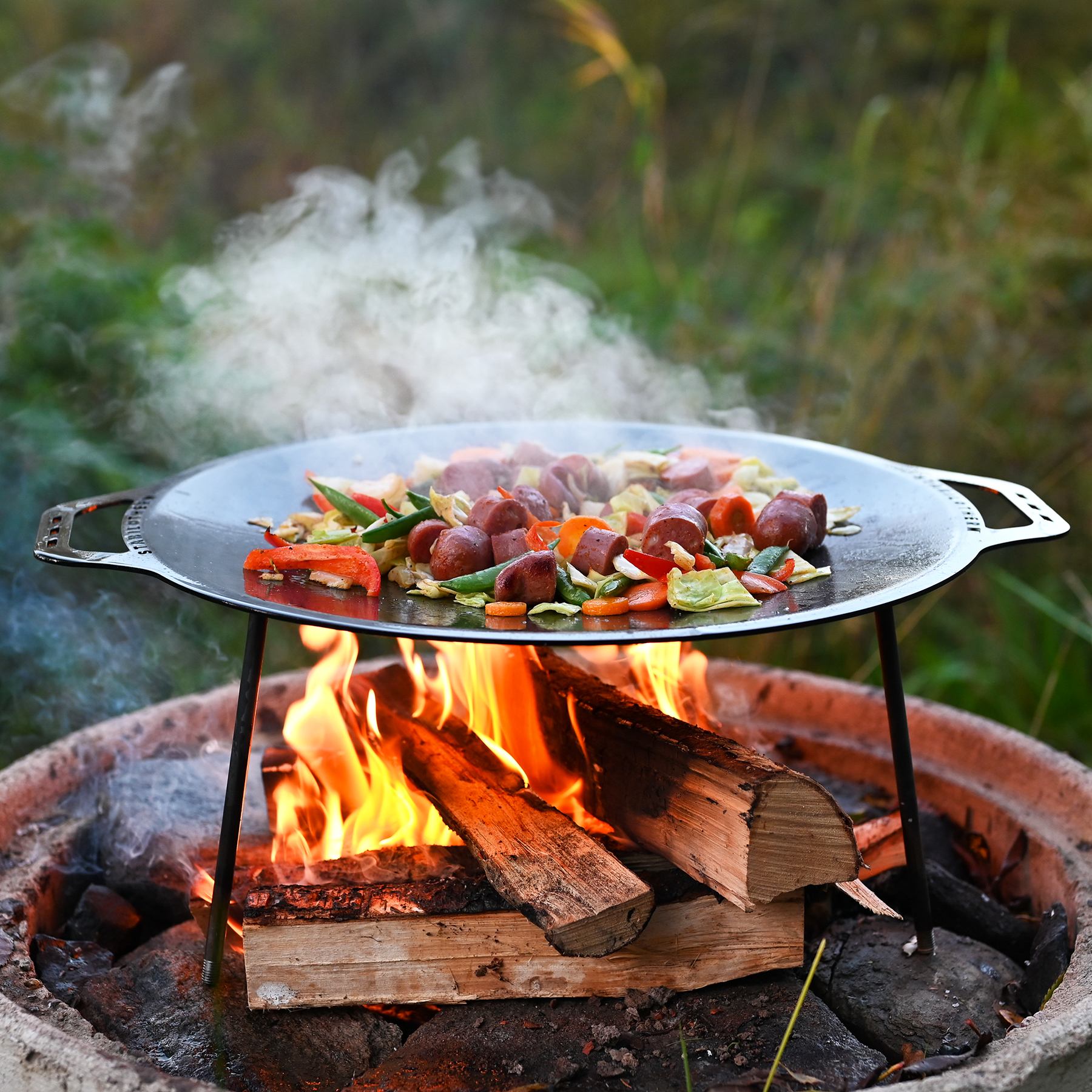 Stabilotherms nya stekhäll i kolstål inkl. stativ är ett robust och mångsidigt redskap för matlagning över öppen eld. Med en generös diameter på 48 cm finns gott om plats att laga mat till både familj och vänner – perfekt för allt från frukost till större måltider ute i naturen. Stekhällen är tillverkad i slitstarkt kolstål som ger snabb och jämn värmefördelning, vilket gör den idealisk för stekning, wokning och grilliknande matlagning. De tre löstagbara benen ger stabilitet över elden och gör den enkel att placera direkt över glöden eller eldstaden. Med en höjd på 20 cm får du en praktisk arbetshöjd samtidigt som värmen fördelas effektivt under hällen. När benen tas av blir stekhällen dessutom smidig att packa och transportera i vår praktiska förvaringspåse i canvas, anpassad för Stabilotherms produkter.